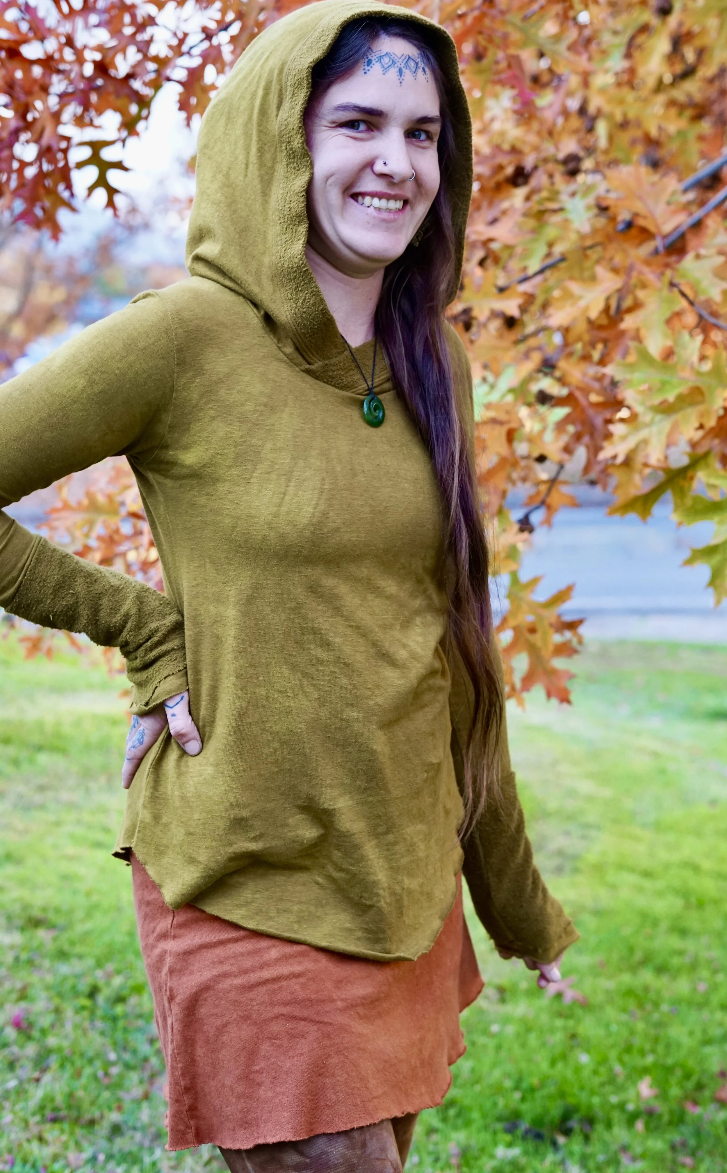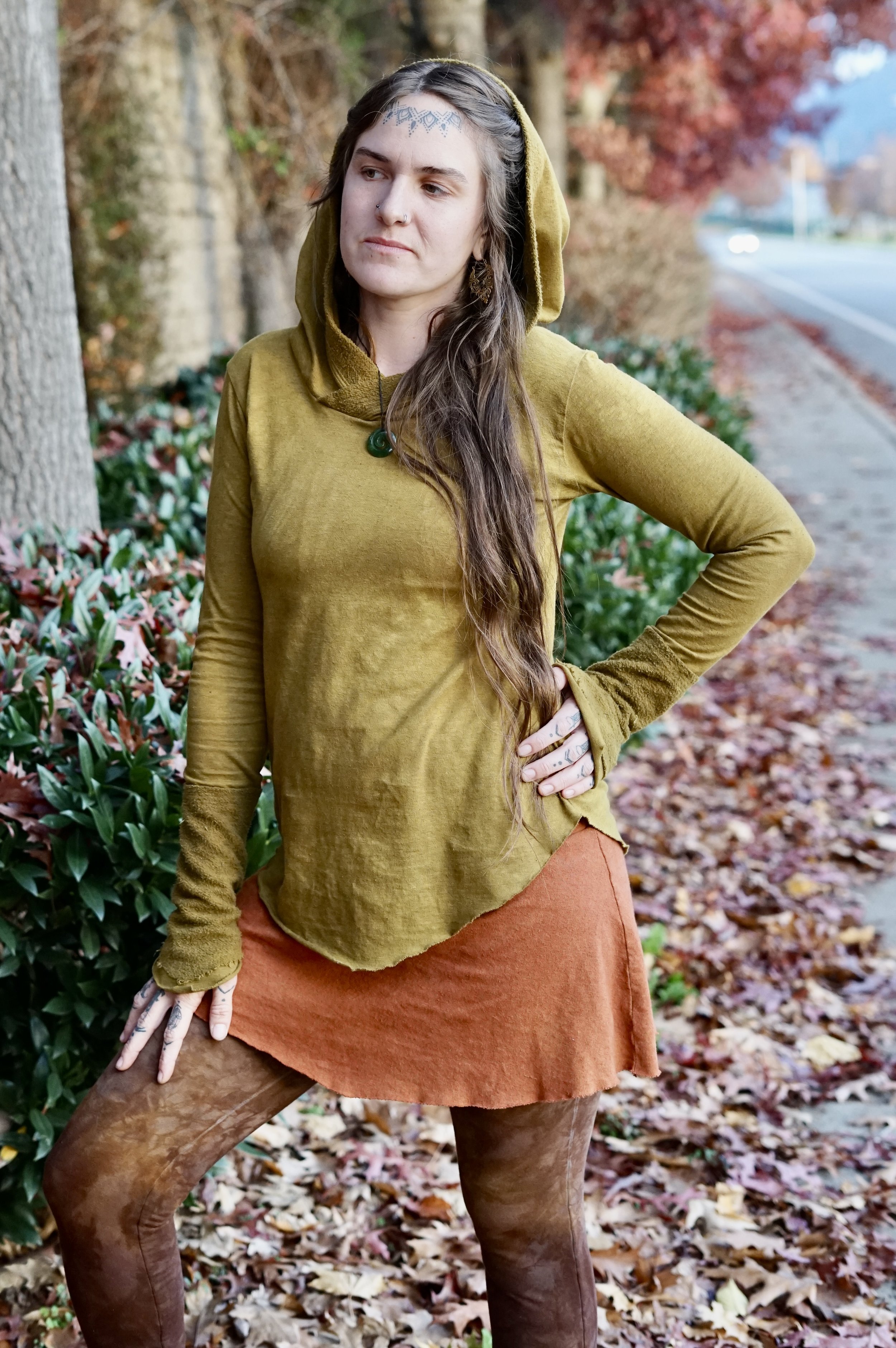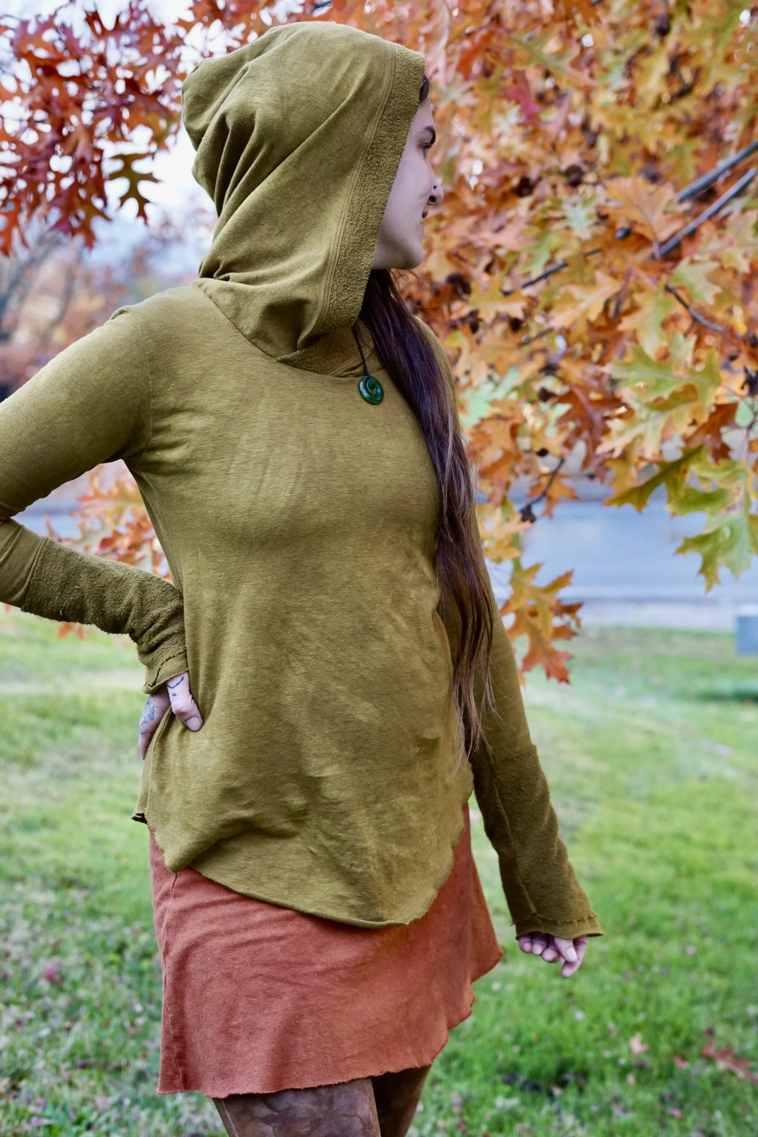 This long sleeved Gaia top is made to be more of a basic pullover but still beautifully adorned with hemp fleece cuffs and trim around the hood. The rest of the shirt is made in HEMP THERMAL which is so soft and cozy on the skin. Perfect pullover & warmer layer when the weather is still chilly. Hand dyed, each one unique, in our mix of Procion hues. The Gaia long sleeved top is one of our winter favorites!