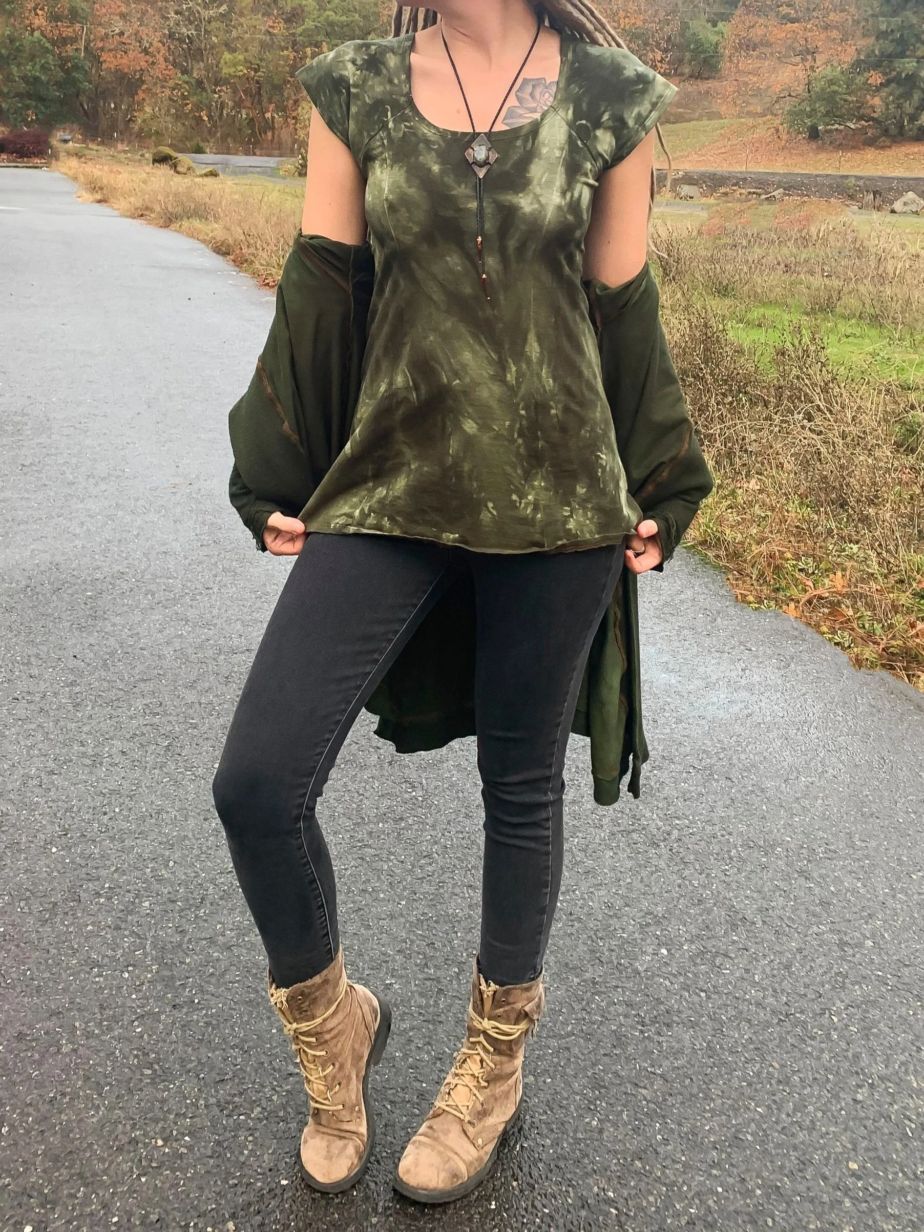 The Tulsi top is a bit fancier than others. This pristine design features princess seams in the front and back, and a low back peek-a-boo scoop that ties at the top, adorned with a brass ornament making sure those sleeves do not fall down. It is made in a tunic length so that it can be layered with any bottom piece giving extra warmth on the booty for these colder months ahead. Made with our medium weight organic hemp and cotton 5 way stretch fabric to provide some sturdiness and hand dyed in this unique - one of a kind marbled Sage hue with fiber reactive dyes. This comfy Tulsi top is gorgeous and outrageously versatile.